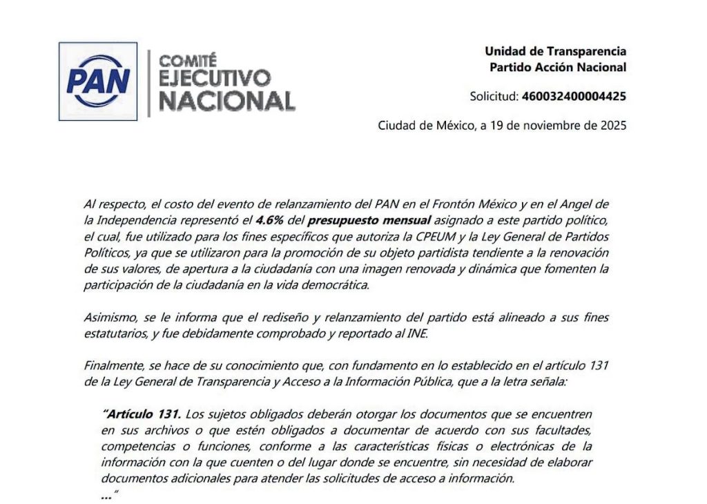 Al respecto, el Comité Ejecutivo Nacional del blanquiazul puntualizó que dicho gasto implicó el uso de 4.6% del presupuesto mensual que tiene autorizado por el Instituto Nacional Electoral (INE), es decir, 102.8 millones de pesos.