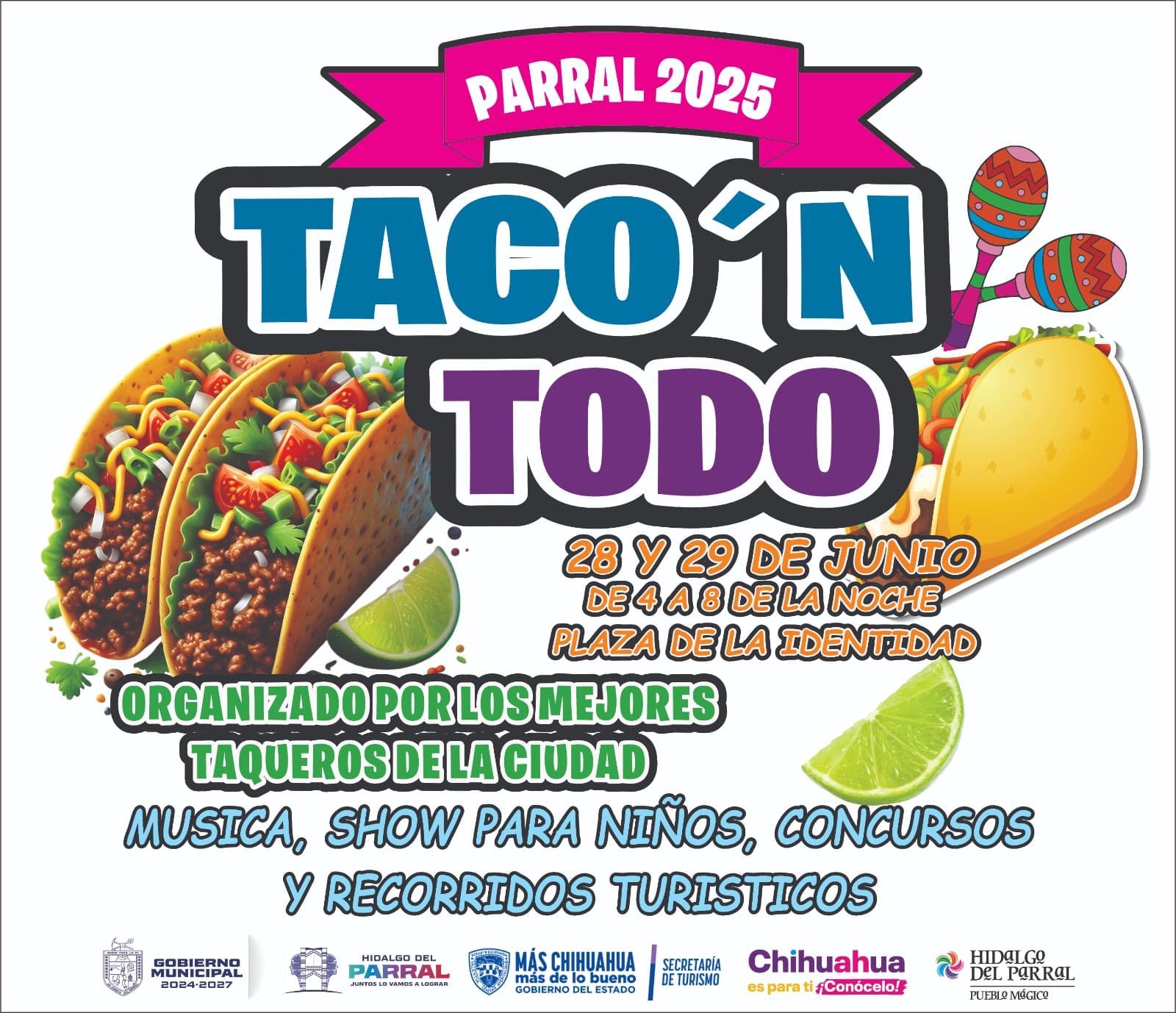 El Gobierno de Parral anunció que los días 28 y 29 de junio se celebrará el festival gastronómico “Taco’N Todo 2025”, en el marco del programa estatal “Chihuahua es para ti ¡Conócelo!”, promovido por la Secretaría de Turismo de Gobierno del Estado. Esta actividad se incorpora de manera oficial al calendario de eventos turísticos del estado.
