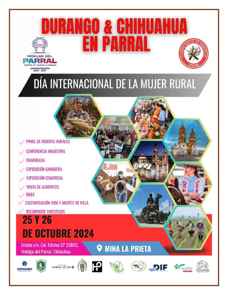 El Gobierno Municipal, en coordinación con la Confederación Nacional Campesina (CNC) de Durango, convocan a la ciudadanía a participar en las actividades que, en el marco del Día Internacional de la Mujer Rural, se llevarán a cabo este 25 y 26 de octubre en Parral.