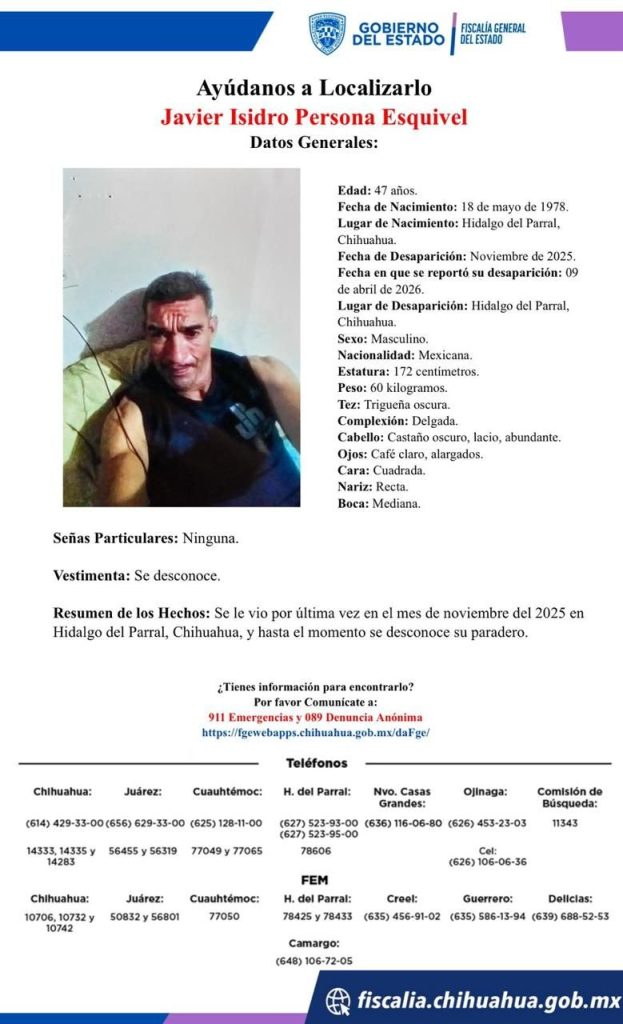 La incertidumbre rodea la desaparición de Javier Isidro Persona Esquive, de 47 años de edad, cuyo caso fue reportado ante las autoridades varios meses después de haber sido visto por última vez en Hidalgo del Parral, Chihuahua.