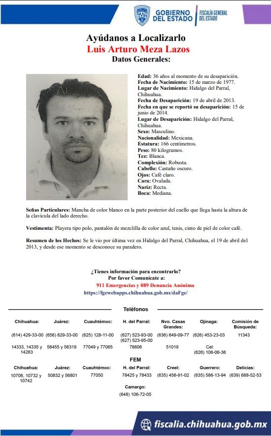 A más de una década de su desaparición, Luis Arturo Meza Lazos, originario de Hidalgo del Parral, continúa sin ser localizado, por lo que autoridades mantienen activa su pesquisa y solicitan el apoyo de la ciudadanía para obtener información que ayude a dar con su paradero.
