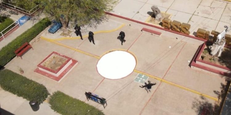 Como parte de los simulacros que se desarrollan de manera periódica, la Dirección de Seguridad Pública Municipal realizó una intervención de portación o uso de armas en el CBTis 228 con el objetivo de brindar herramientas que les permita actuar en una situación de riesgo.