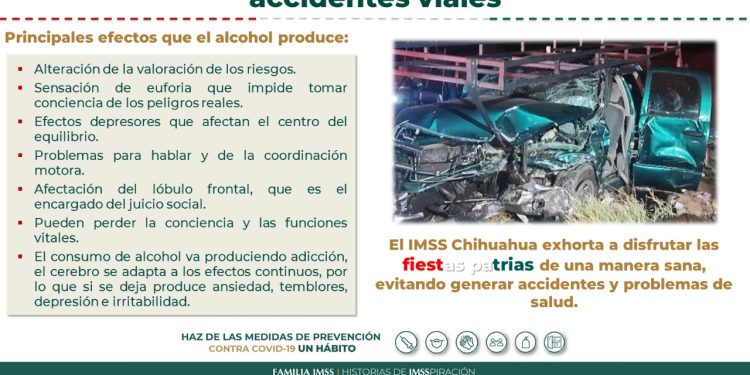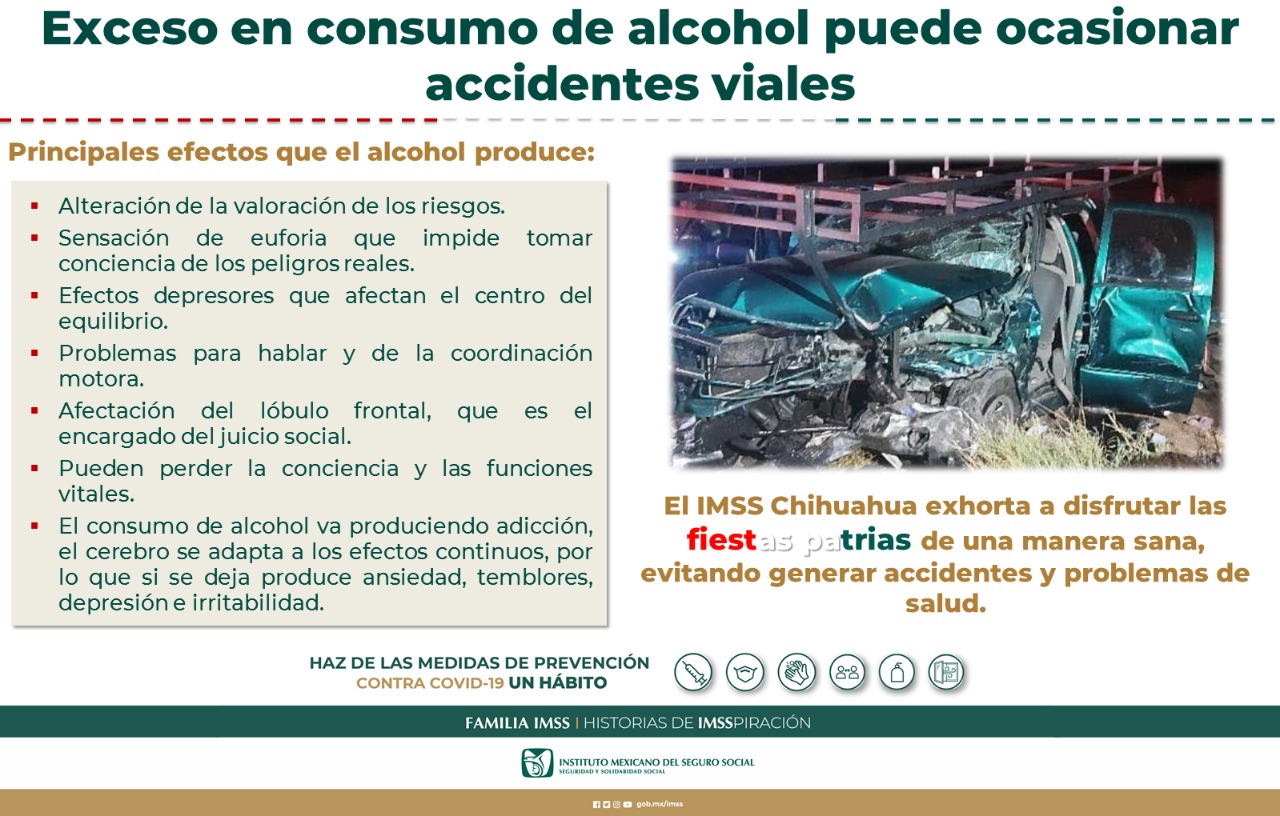 El Instituto Mexicano del Seguro Social (IMSS) en Chihuahua exhorta a la población a no excederse en el consumo de bebidas alcohólicas en las fiestas patrias.