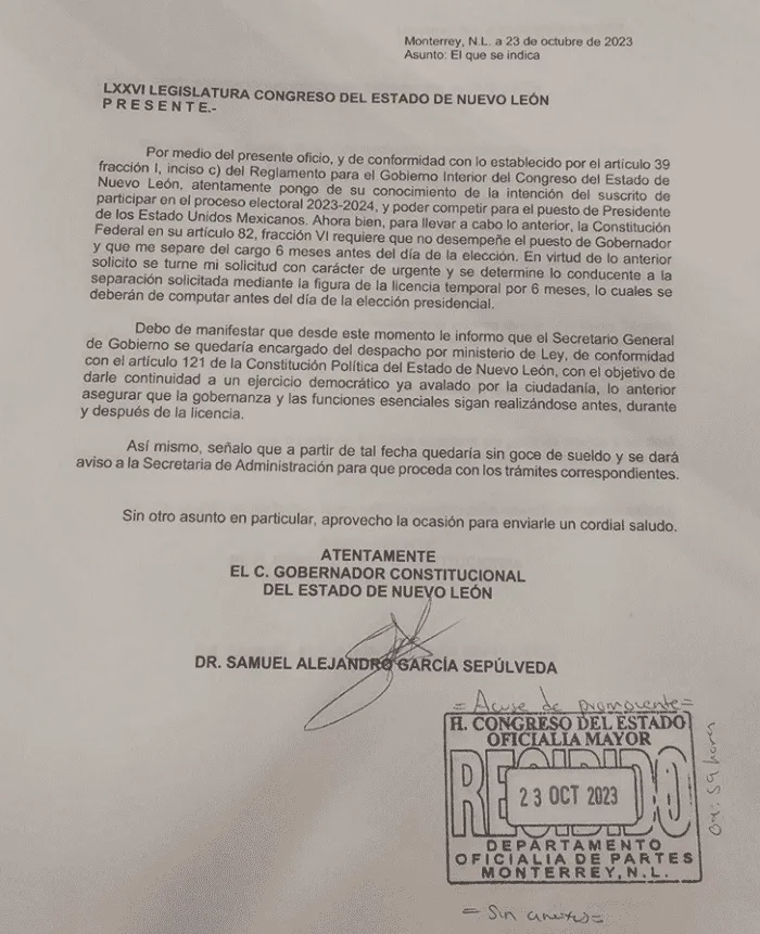 El gobernador de Nuevo León, Samuel García Sepúlveda, pidió licencia a su cargo para separarse y buscar la candidatura por su partido, Movimiento Ciudadano, a la Presidencia de la República en 2024.