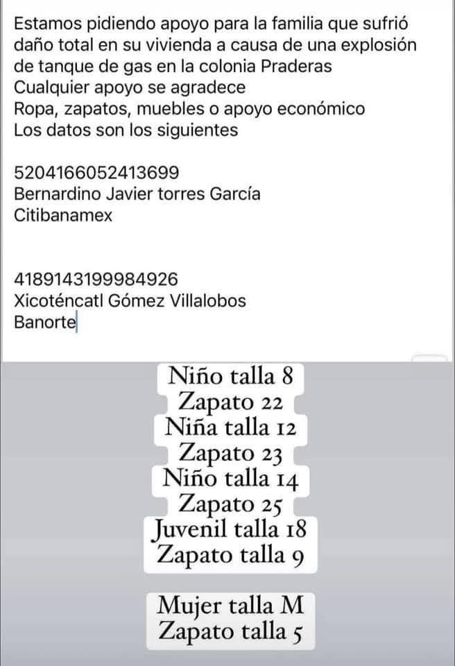 En una de las publicaciones solicitan ropa, zapatos, muebles o apoyo económico y ponen a disposición dos cuentas bancarias para recibir depósitos, una a nombre de Bernardino Javier Torres García, de Citibanamex, con número 5204166052413699; y otra de Banorte a nombre de Xicoténcatl Gómez Villalobos, con número 4189143199984926.