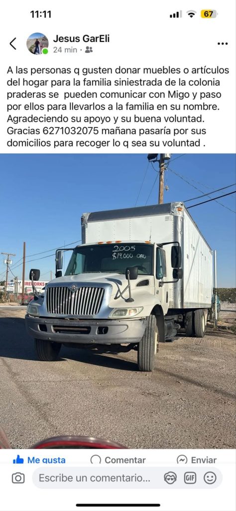 Otra persona puso a disposición un camión de mudanza en el que podría transportar muebles o artículos del hogar que sean donados para los afectados, ofreciéndose a recoger lo recolectado hasta domicilio, para lo cual comparte su número de teléfono móvil para que le contacten, siendo este el 6271032075.
