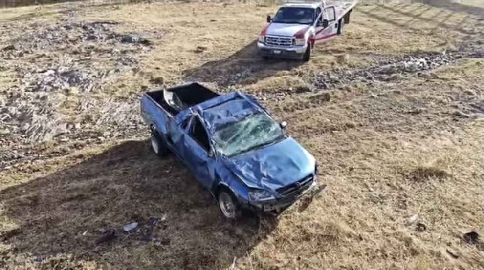 La unidad involucrada fue identificada como una Chevrolet Tornado color azul, la cual presentó daños totales tras el impacto y posterior volcadura.