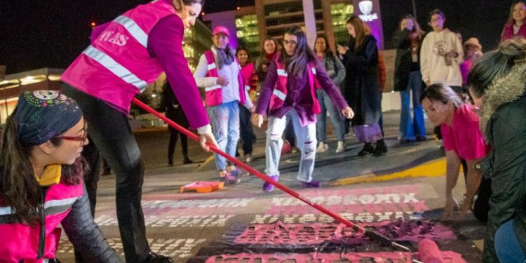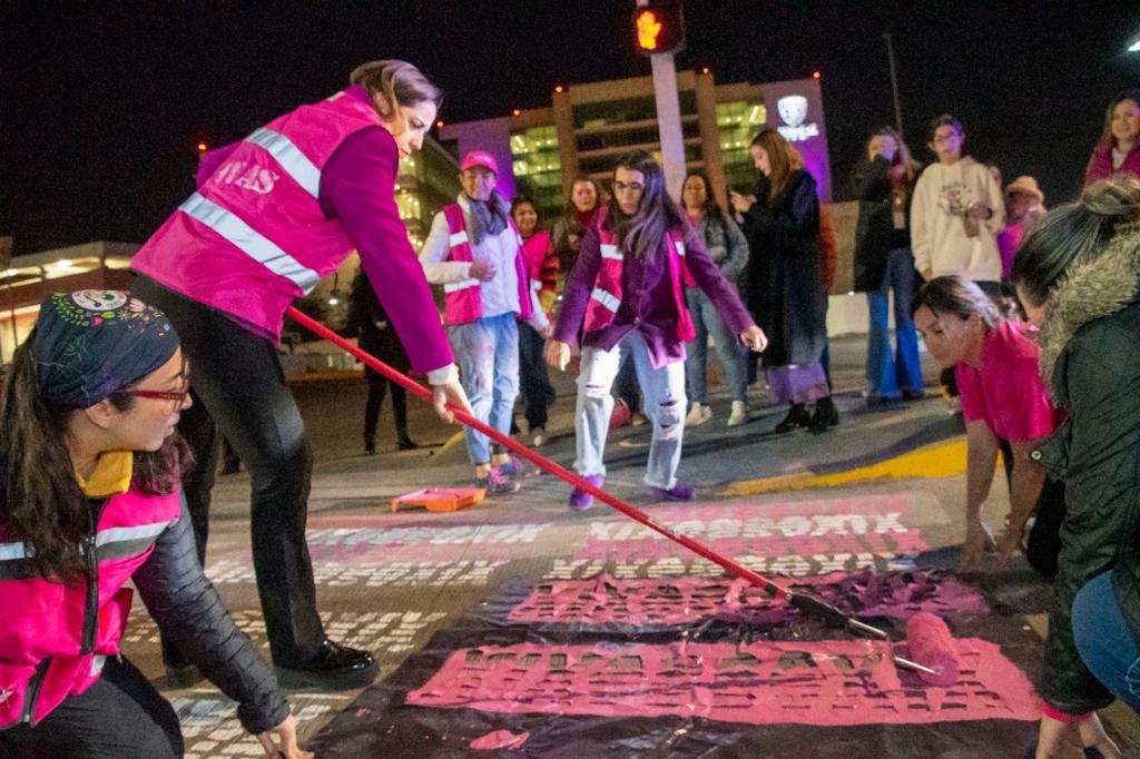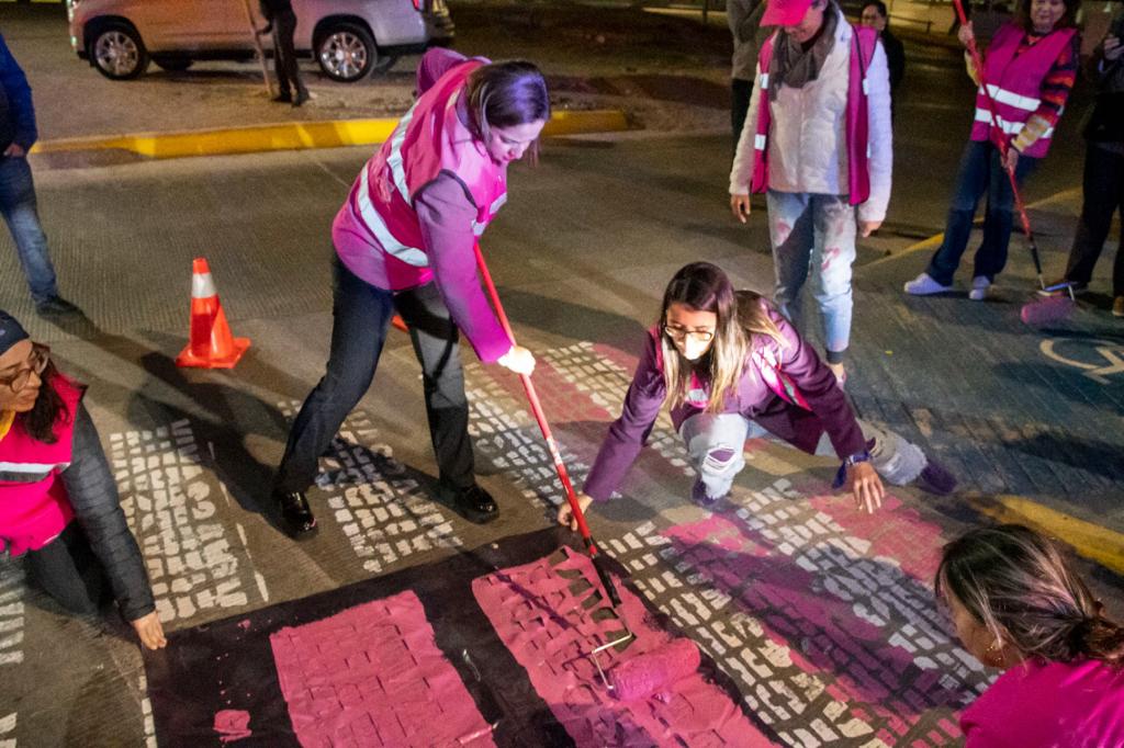 La magistrada presidenta, Myriam Victoria Hernández Acosta, en compañía de la presidenta del Tribunal Estatal Electoral, Roxana García Moreno, así como de la directora de Derechos Humanos e Igualdad de Género, Flor Alejandra Corral, y por supuesto de la impulsora del proyecto, Erika Rascón, iniciaron con la pinta del paso peatonal del cruce de la avenida Ocampo y Doblado, justo frente al Poder Judicial, una zona en la que a diario transitan miles de mujeres chihuahuenses.