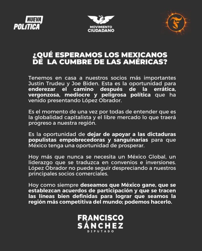 El diputado local Francisco Sánchez Villegas se refirió a la Cumbre de Líderes de América del Norte como una oportunidad para enderezar el camino después de la errática, vergonzosa, mediocre y peligrosa política que ha venido presentando el presidente Andrés Manuel López Obrador.