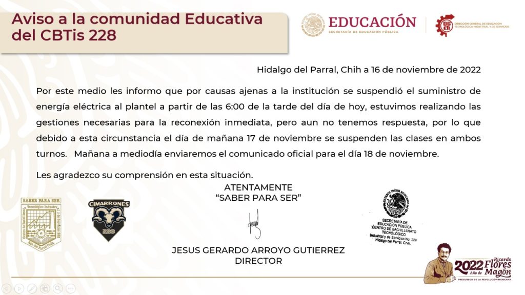 Por su parte, Jesús Gerardo Arroyo Gutiérrez, director del CBTis 228, optó por suspender clases para este jueves 17 de noviembre y «hasta nuevo aviso».