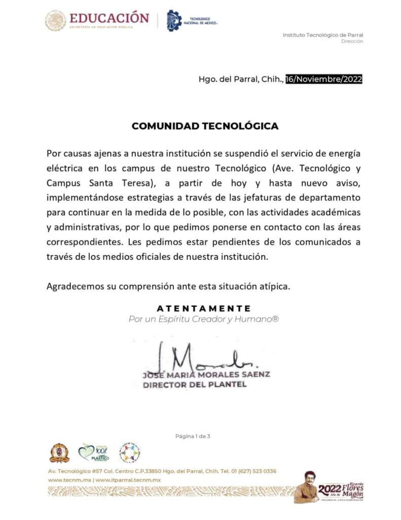 A través de medios internos de difusión tanto del Tecnológico Nacional de México como del Centro Bachillerato Tecnológico Industrial y de Servicios, informaron a sus respectivas plantillas laborales que habían suspendido el servicio de energía eléctrica.