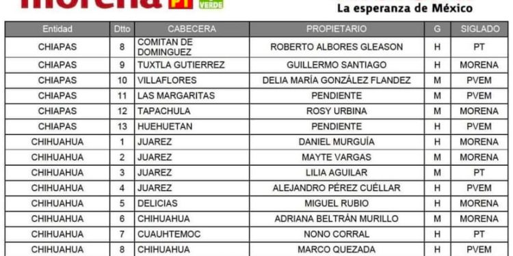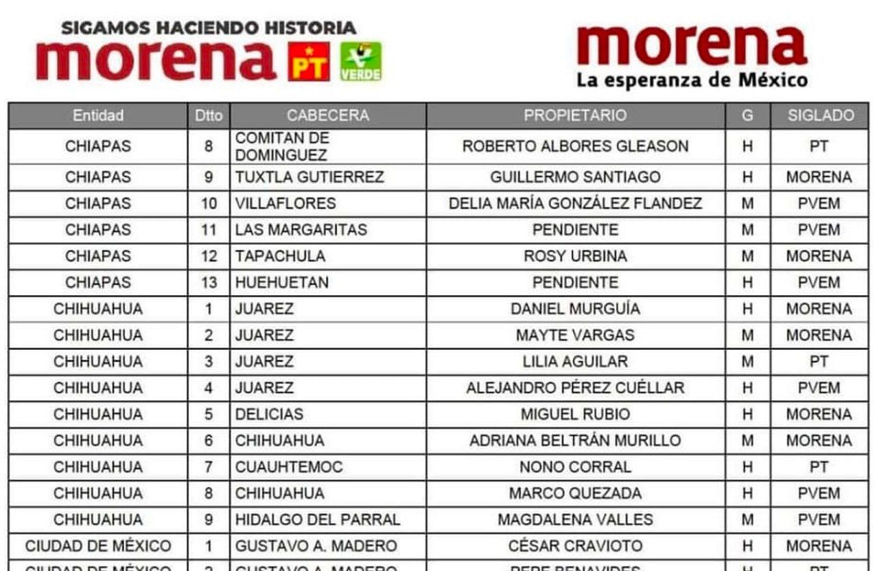 La lista de candidatos incluye figuras de los partidos Morena, PT y Partido Verde para los diferentes distritos, con el objetivo de lograr la mayoría calificada en las Cámaras del Congreso de la Unión.