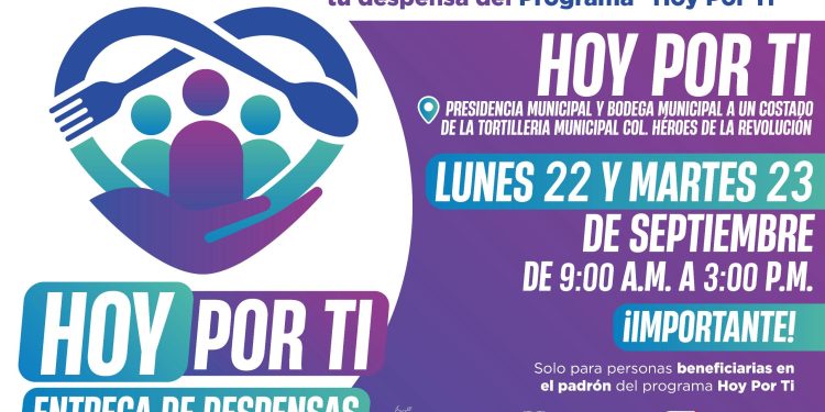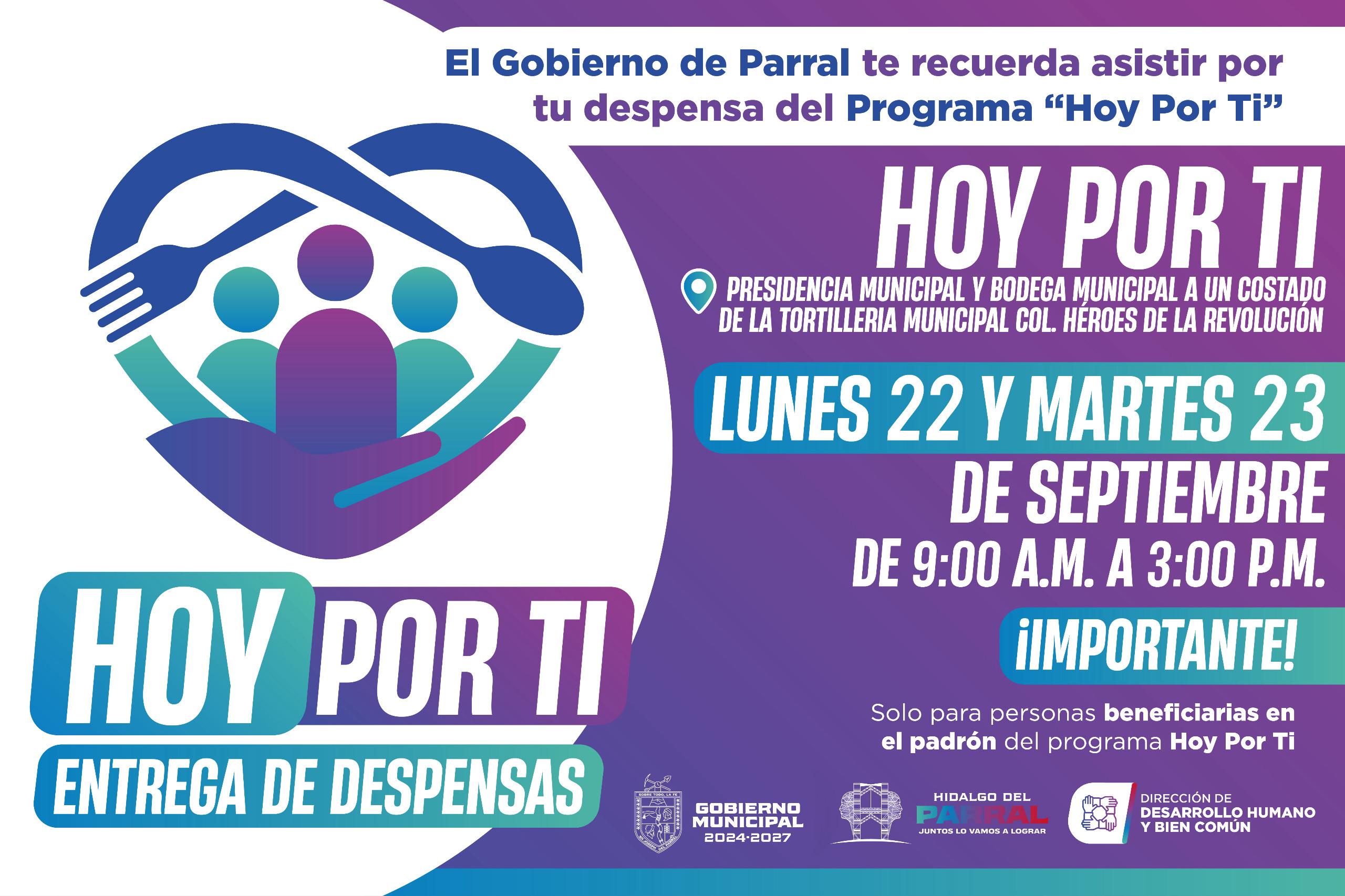 El Gobierno de Parral informa a la ciudadanía que el próximo lunes 22 y martes 23 de septiembre se llevará a cabo la entrega de despensas correspondientes al programa social “Hoy Por Ti”, con el propósito de respaldar a las familias que más lo requieren en el municipio.