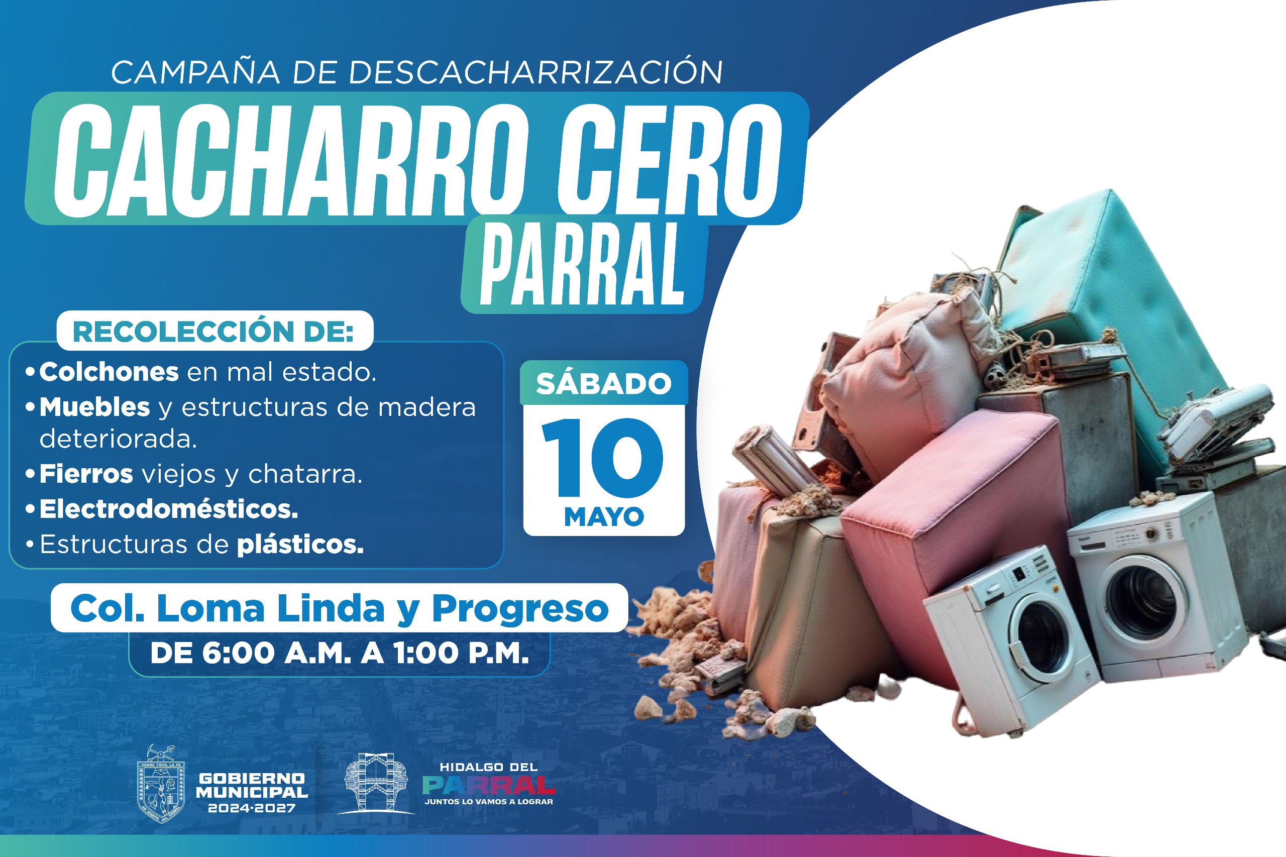 Este sábado 10 de mayo se llevará a cabo una nueva jornada del programa “Cacharro Cero Parral” en las colonias Loma Linda y Progreso, con el propósito de fortalecer las acciones de limpieza y eliminar factores que puedan representar un riesgo para la salud pública.