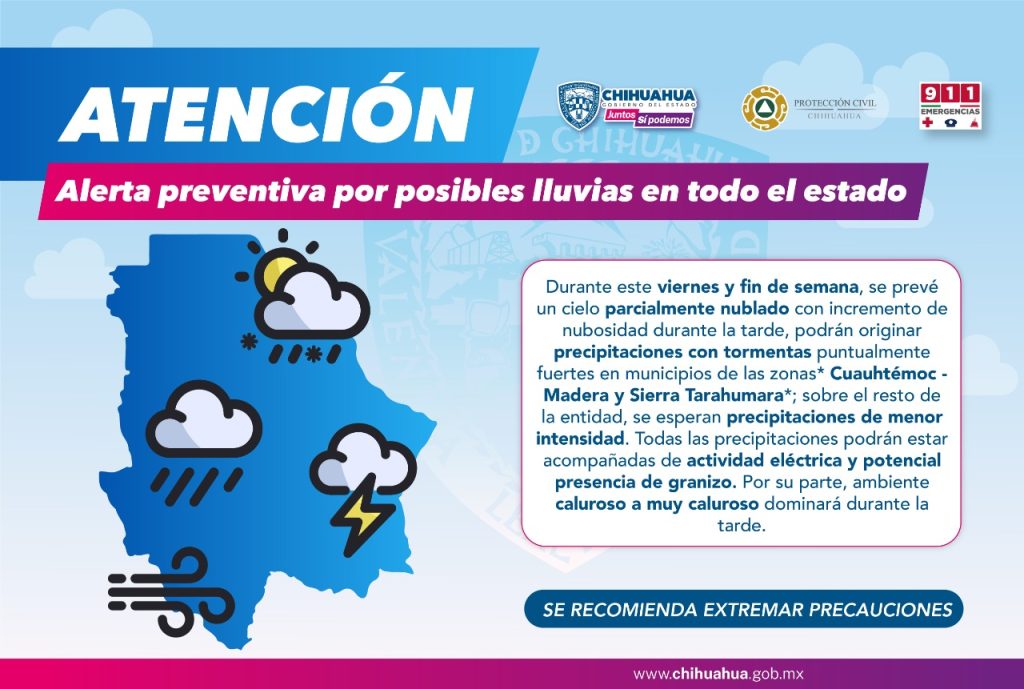 Las lluvias que podrían estar acompañadas de actividad eléctrica y potencial presencia de granizo, se esperan a partir de las 3 de la tarde en gran parte del estado, por lo cual se incrementará la nubosidad, ocasionando fuertes tormentas en municipios de las zonas de Cuauhtémoc-Madera y de la Sierra Tarahumara; así como precipitaciones de menor intensidad en otras regiones.