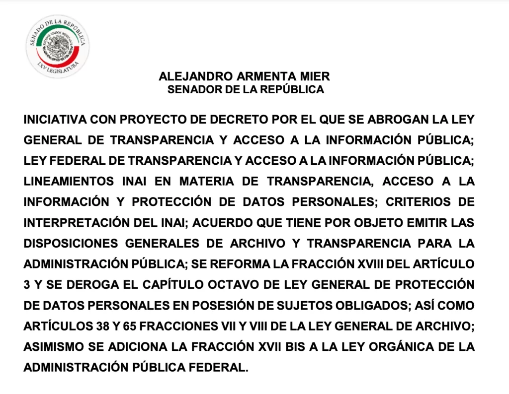 El senador Aejandro Armenta, de Morena, propuso hoy una iniciativa para derogar la Ley General de Transparencia y Acceso a la Información Pública, así como desaparecer al INAI y que sus funciones sean absorbidas por la Secretaría de la Función Pública.
