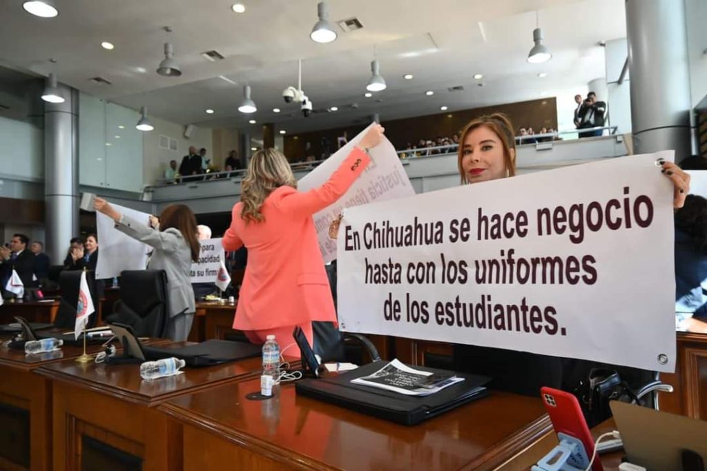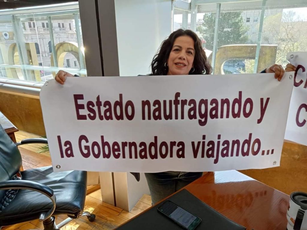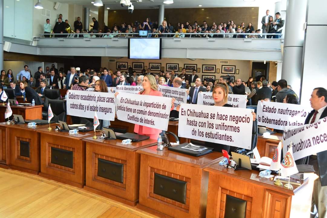 Los legisladores mostraron lonas con varias consignas desde que la mandataria arribó al pleno del Congreso, y desde sus lugares exhibieron las mantas. En contraparte, las demás bancadas aplaudían a la gobernadora.