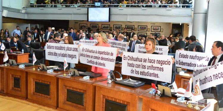Los diputados de Morena en el Congreso del Estado, realizaron una protesta pacífica ante la presencia de la gobernadora María Eugenia Campos Galván, con motivo de la entrega de su Primer Informe de Resultados, y señalaron corruptelas, falta de obra, falta de transparencia y otros problemas que no han sido atendidos.