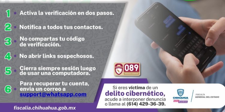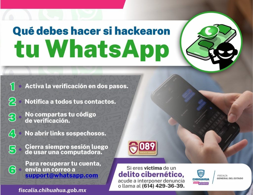 La Fiscalía General del Estado y la Unidad de Delitos Cometidos a Través de Medios Tecnológicos y Extorsión, informa los pasos a seguir para recuperar el control de una cuenta de WhatsApp vulnerada.