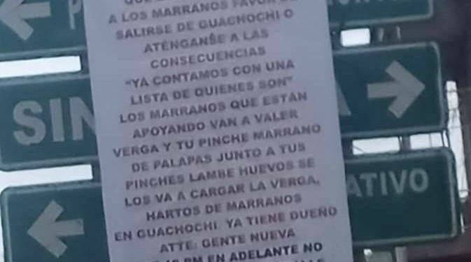 Al menos dos mantas con mensajes intimidantes, presuntamente hechas por integrantes del grupo delincuencial «Gente Nueva», fueron colocadas en Guachochi, en las que advierten que no responderán por quienes salgan a la calle después de las 10 de la noche.
