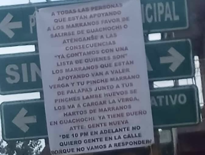 Al menos dos mantas con mensajes intimidantes, presuntamente hechas por integrantes del grupo delincuencial «Gente Nueva», fueron colocadas en Guachochi, en las que advierten que no responderán por quienes salgan a la calle después de las 10 de la noche.