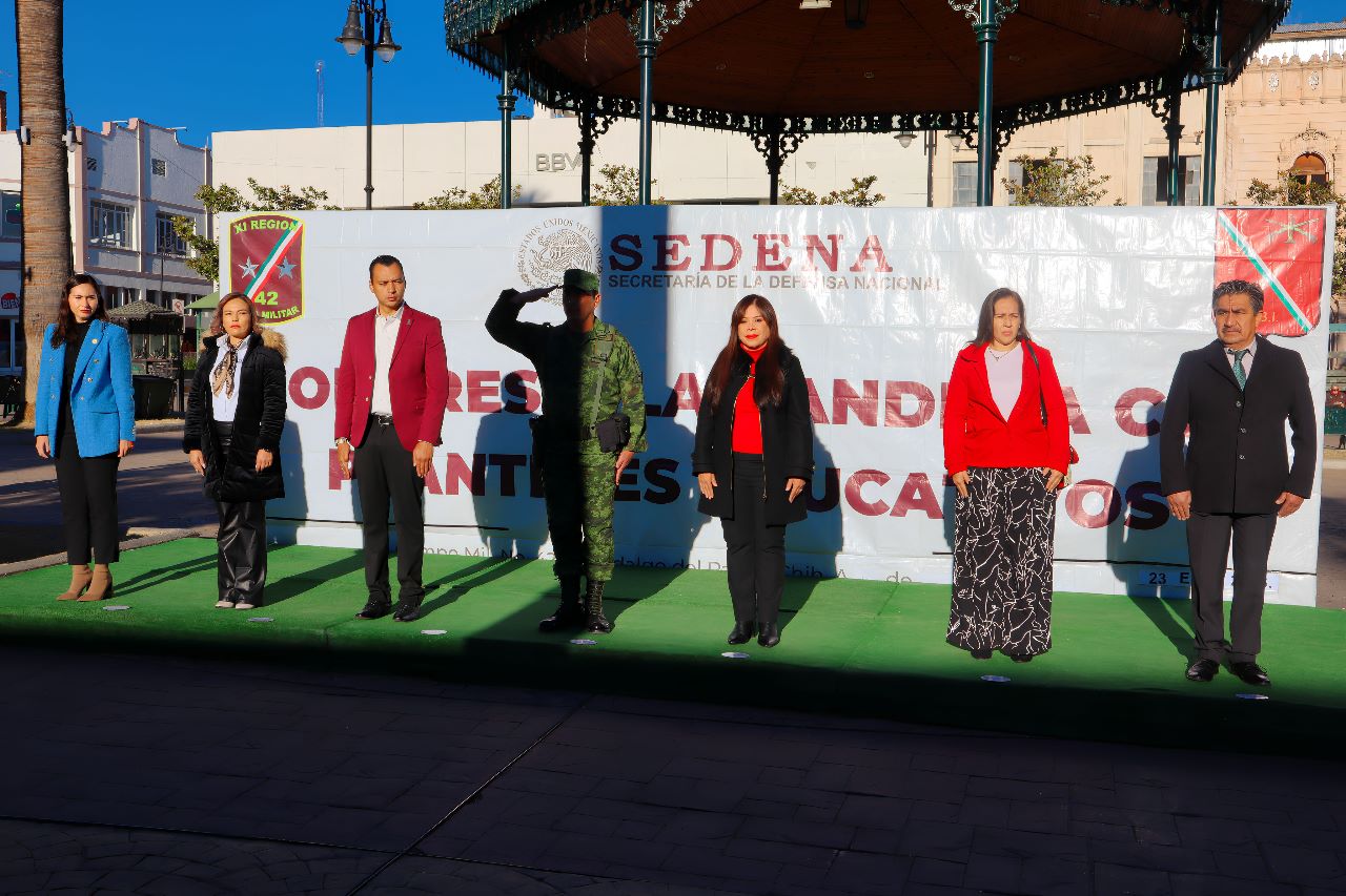 La mañana de este lunes, la Secretaría de la Defensa Nacional realizó los Honores a la Bandera en compañía de directivos de planteles educativos en la Plaza de Armas, mejor conocida como Plaza Principal de Parral.