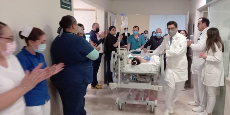 El personal del HGR No. 66 realizó una valla humana para despedir con aplausos a la donante, como símbolo de gratitud por este importante acto solidario.