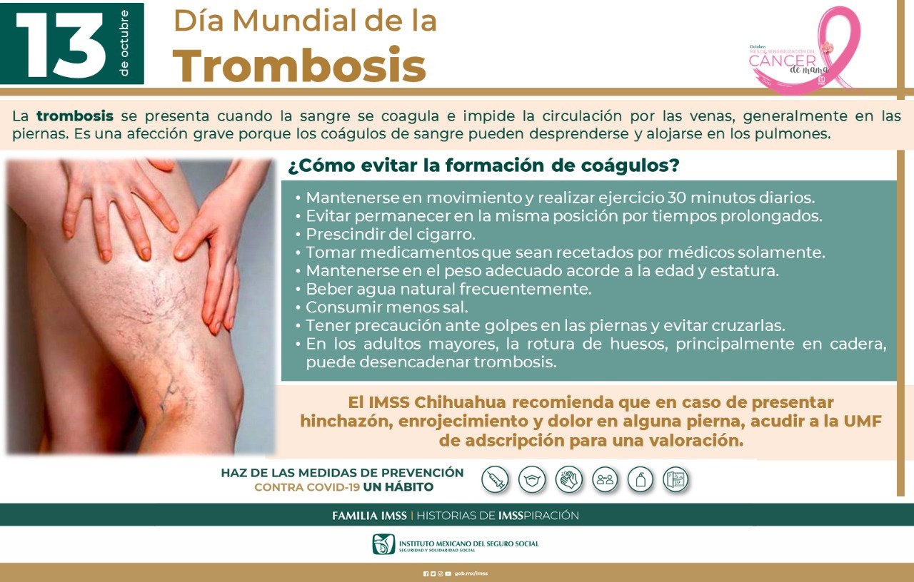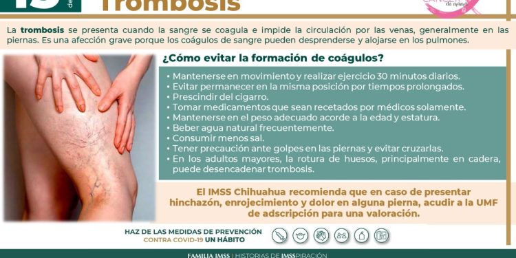 En el marco del Día Mundial de la Trombosis que se celebra este 13 de octubre, el Instituto Mexicano del Seguro Social (IMSS) en Chihuahua informó que esta condición se produce cuando se forma un coagulo de sangre (trombo) en las venas del cuerpo, generalmente en las piernas, es considerada una enfermedad grave, ya que puede desencadenar diversos padecimientos que ponen en riesgo la vida.