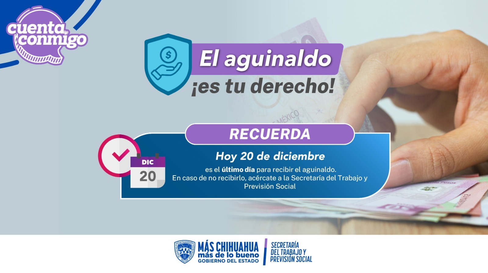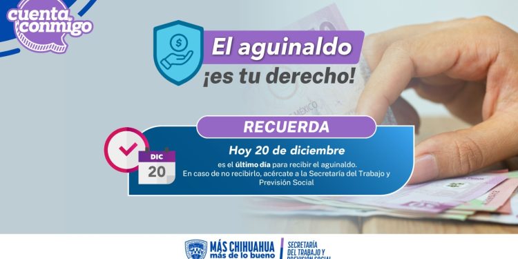 La Secretaría del Trabajo y Previsión Social (STPS) informó a las y los trabajadores de Chihuahua, que hoy 20 de diciembre de 2024 es el último día para recibir la prestación del aguinaldo, por lo que deberán percibir un mínimo de 15 días de sueldo por año laborado, o bien el monto proporcional al tiempo que se haya trabajado.