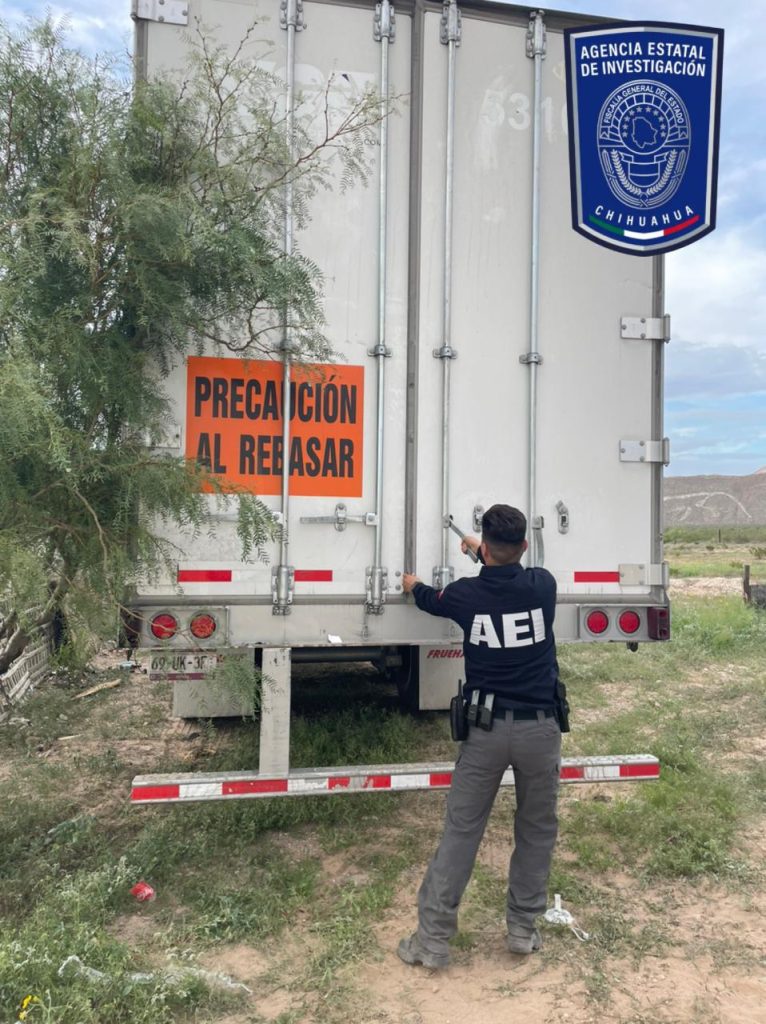 Durante las diligencias desarrolladas en relación a la denuncia por robo con violencia interpuesta por los afectados, elementos de la Agencia Estatal de Investigación (AEI), localizaron abandonada la caja de un tráiler, en una brecha de terracería ubicada en la carretera Juárez-Ascensión, sobre el camino a la antigua caseta de la ex aduana.