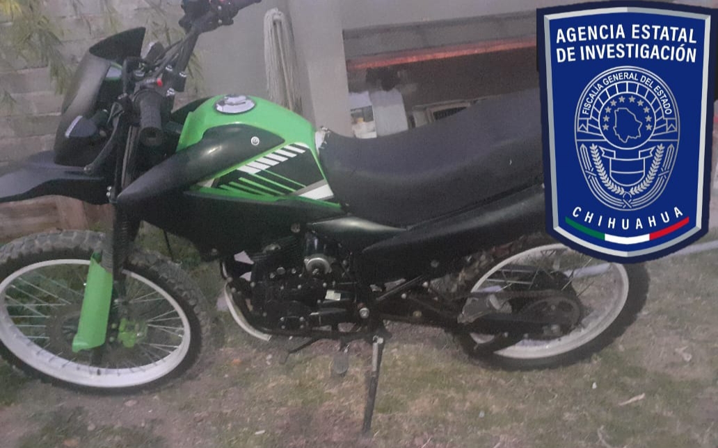 Elementos de la Agencia Estatal de Investigación recuperaron una motocicleta marca Italika, línea DM200, modelo 2019, color negro con verde, que contaba con reporte de robo interpuesto el día 22 de noviembre del presente año en el citado municipio de Jiménez.