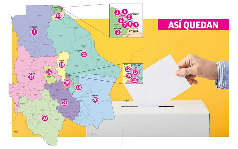 Los Distritos 2 con representación de Leticia Ortega (Morena), 3 con representación de Oscar Avitia (Morena), 4 Rosana Días (Morena), 5 Marisela Terrazas (PAN), 6 Deyanira Ozaeta (PT), 7 Gustavo de la Rosa (Morena), 8 Cuauhtémoc Estrada (Morena), 9 Magdalena Rentería (Morena) y 10 María Antonieta Pérez (Morena) con cabecera todos en el Municipio de Juárez, no presentan cambio alguno y su demarcación territorial continuará dividida en las zonas de la ciudad fronteriza y sus sectores rurales que abarcan hasta el Valle de Juárez.