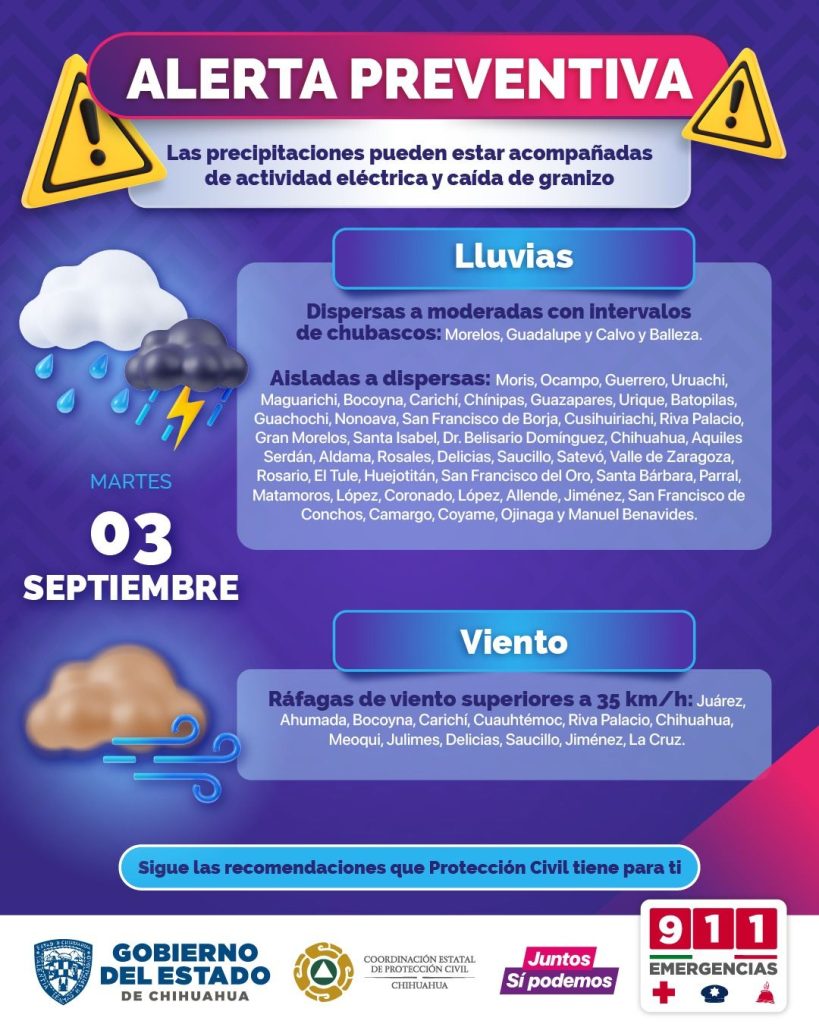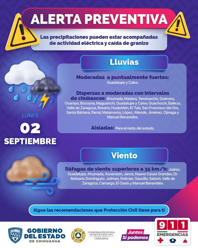 Para este lunes 2 de septiembre se esperan lluvias moderadas a puntualmente fuertes en Guadalupe y Calvo, y de dispersas a moderadas con intervalos de chubascos para el resto del estado.