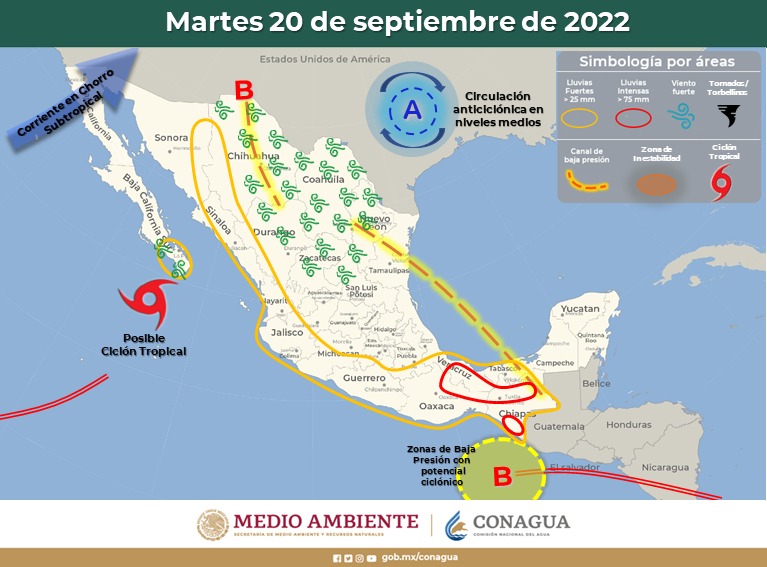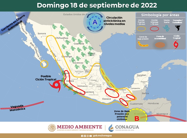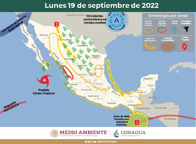 La Coordinación Estatal de Protección Civil (CEPC), con base en la información emitida por el Servicio Meteorológico Nacional (SMN), informó que a partir de la tarde de domingo 18 de septiembre se prevén lluvias sobre el zona noroeste y oeste del estado, especialmente en Madera, Moris, Ocampo, Uruachi, Chínipas, Guazapares, Urique y Guachochi mientras que para el resto del estado se pueden presentar lluvias dispersas a moderadas.