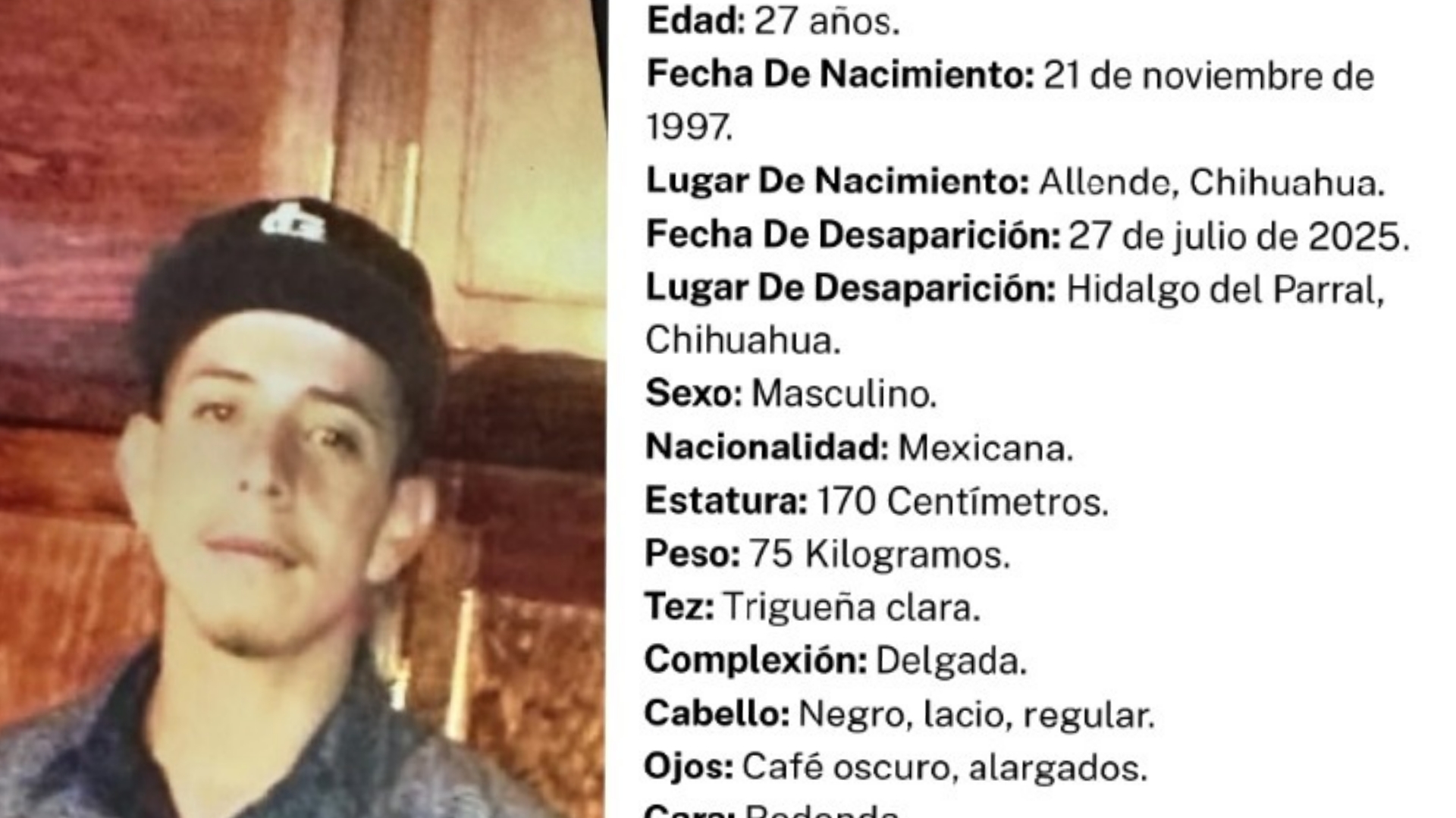 José Ramón es originario del municipio de Allende, Chihuahua, y al momento de su desaparición vestía short naranja, playera gris, tenis negros, además de portar una cachucha y lentes de sol, según datos proporcionados por la Fiscalía General del Estado.