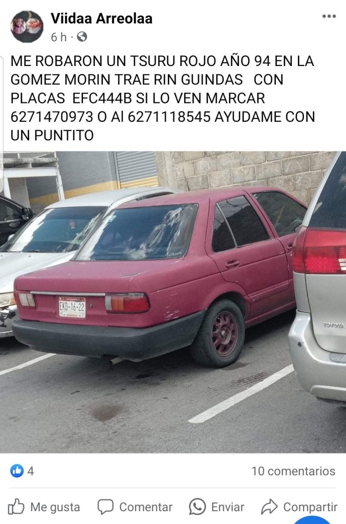 Una usuaria de Facebook, identificada como Viidaa Arreolaa, posteó un mensaje en el que detalle que fue víctima del robo del vehículo ya descrito, modelo 1994 y de color rojo con rines guindas.