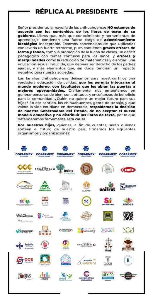 Organizaciones de la sociedad civil y empresarial del estado de Chihuahua, se pronunciaron en apoyo a la decisión de la gobernadora Maru Campos, de impedir en la entidad la distribución de los nuevos libros de texto gratuitos elaborados por el Gobierno de la República.