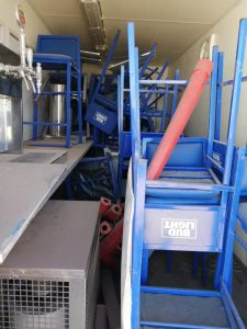 Además, dos remolques, ambos rotulados con logos de la empresa afectada y diverso mobiliario.