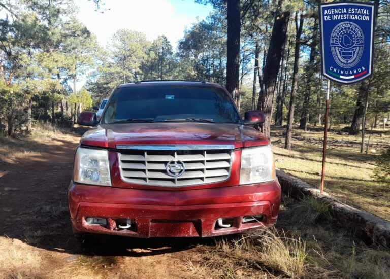 Dentro de los operativos de seguridad desplegados por la Agencia Estatal de Investigación en el municipio de Guachochi, fue localizada una camioneta de la marca Cadillac, línea Escalade, modelo 2003, color guinda, que contaba con reporte de robo en Albuquerque, Nuevo México.