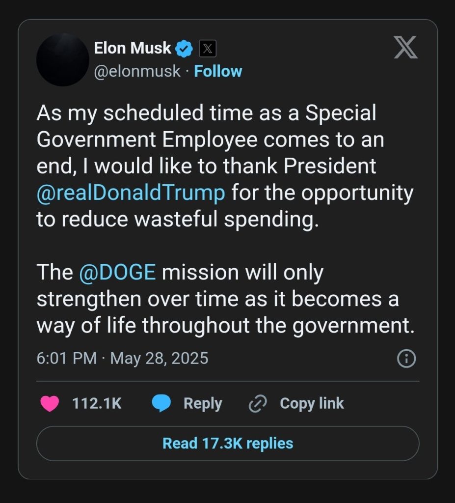 «Ahora que mi tiempo programado como Empleado gubernamental especial llega a su fin, quiero dar las gracias al presidente Donald Trump por la oportunidad de reducir el gasto despilfarrador», dijo Musk en un breve mensaje en su cuenta de X.