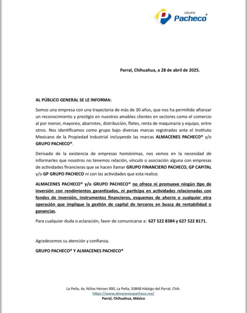 «Derivado de la existencia de empresas homónimas, nos vemos en la necesidad de informarles que nosotros no tenemos relación, vinculo o asociación alguna con empresas de actividades financieras que se hacen llamar GRUPO FINANCIERO PACHECO, GP CAPITAL y/o GP GRUPO PACHECO ni con las actividades que esta realice ALMACENES PACHECO y/o GRUPO PACHECO no ofrece ni promueve ningún tipo de inversión con rendimientos garantizados, ni_ participa en actividades relacionadas con fondos de_inversión, instrumentos financieros,_esquemas de ahorro o cualquier otra operación que implique la gestión de capital de terceros en busca de rentabilidad«, abundan.