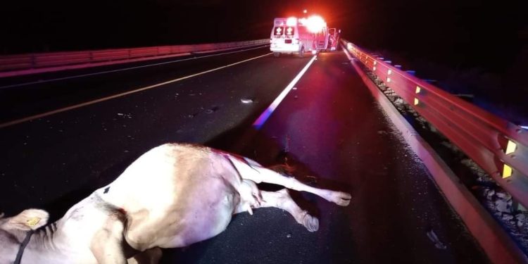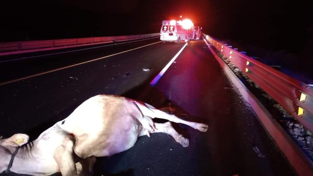 El semoviente se encontraba sobre la carretera y al no percatarse del animal, se impactaron contra ella, hecho que dejó a una mujer con dolor en brazo, por lo que fue atendida por los paramédicos sin que requiriera traslado a un hospital.