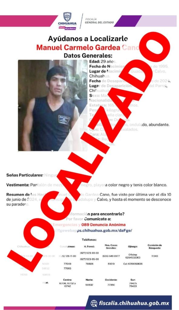 Derivado de la activación de los protocolos de búsqueda e investigación, dicha persona de nombre Manuel Carmelo G. C., fue localizado este jueves 20 de junio en el municipio de Guadalupe y Calvo.