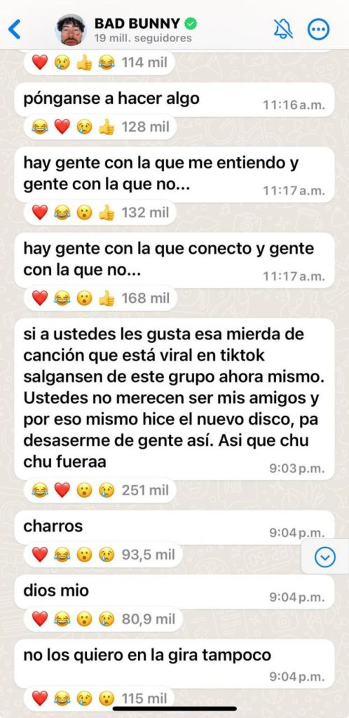 “Si a ustedes les gusta esa mier** de canción que está viral en tiktok salgansen de este grupo ahora mismo. Ustedes no merecen ser mis amigos y por eso mismo hice el nuevo disco, pa desaserme de gente así. Asi que chu chu fueraa”, escribió Bad Bunny, ante la reacción de los miles de integrantes que integran el canal.