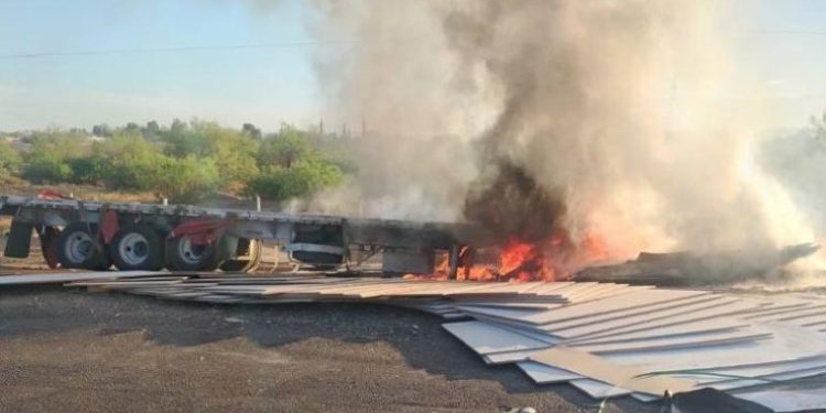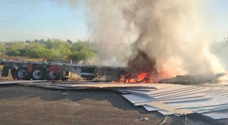 Se INCENDIA tráiler entre Jiménez y Delicias; CIERRAN carretera