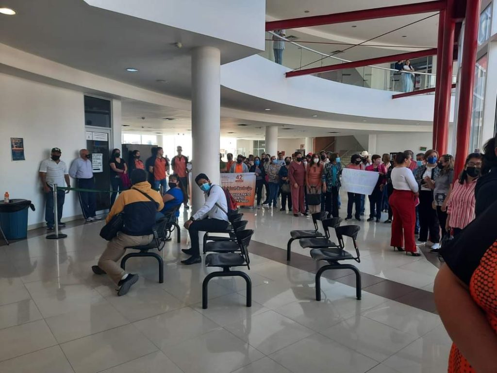 Trabajdore agremiados a la Sección 42 del Sindicato Nacional de Trabajadores del Estado, se manifestaron este viernes en el edificio de Gobierno en Parral para exigir mejoras en el servicio de Pensiones Civiles del Estado.