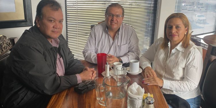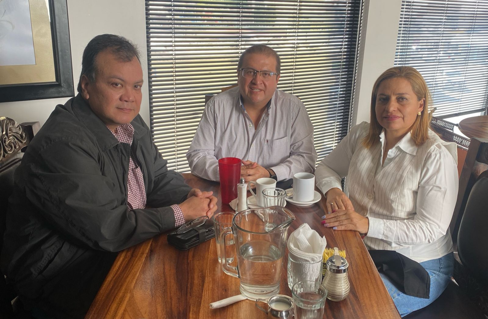 Sentados en una mesa de café se observó a Rocío Allende, Otto Valles y Salvador Calderón, aspirantes a la candidatura por la Presidencia Municipal de Parral por el Partido Mexico Republicano, y las alianzas PT-Morena y PAN-PRI-PRD, respectivamente.
