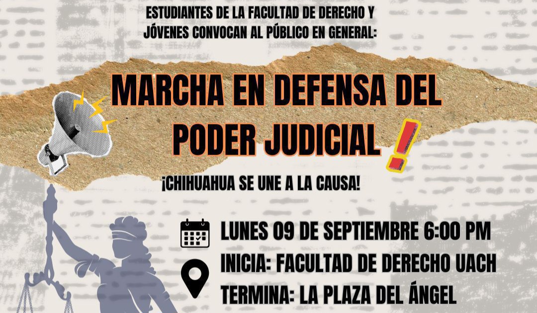 Adicionalmente, para quienes se encuentran en el Distrito Judicial Morelos (Ciudad de Chihuahua): Se invita a acompañar a las y los estudiantes de la Facultad de Derecho de la Universidad Autónoma de Chihuahua a la marcha “En Defensa del Poder Judicial”, que partirá de las instalaciones de la citada facultad, ubicadas en el Campus 1 de la UACH, en punto de las 6 de la tarde para terminar en la Plaza del Ángel. Se sugiere vestir una prenda blanca y llevar sus carteles.