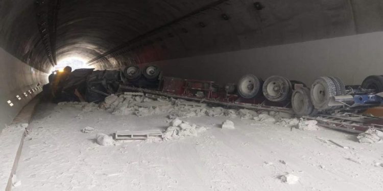 La tarde de ayer domingo, en el kilómetro 181 de la autopista Durango-Mazatlán, un tráiler doble remolque sufrió un accidente de tipo volcadura a la altura del túnel Santa Lucía.