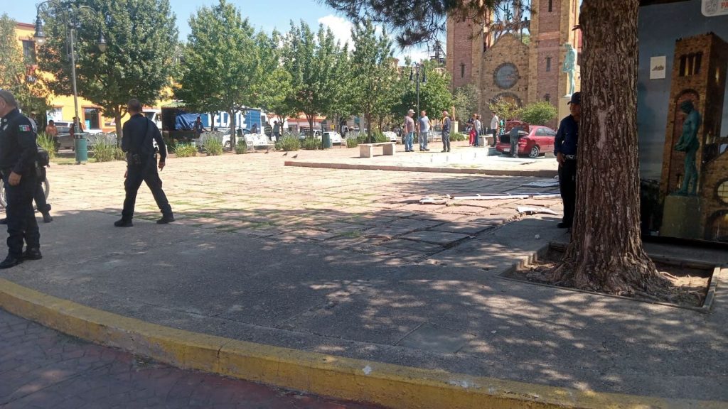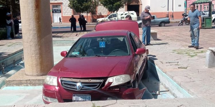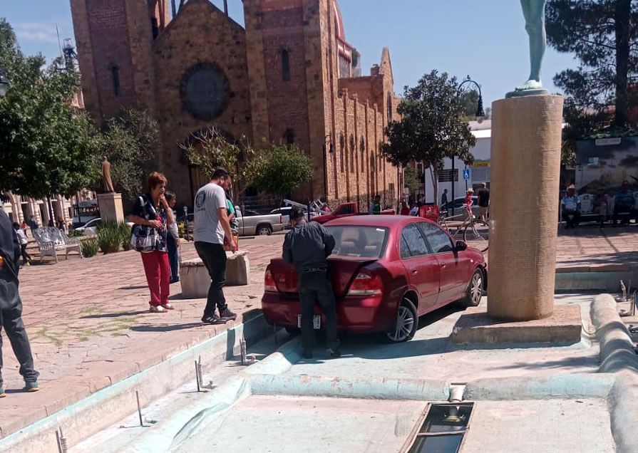 Un adulto mayor que conducía un automóvil sobre la calle Ignacio Ramírez, sufrió un accidente de tránsito, ya que al llegar al cruce con la avenida Centenario, perdió el control y avanzó hasta trepar a la Plaza Guillermo Baca y terminar dentro de la fuente de la misma.